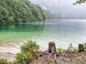 Der Eibsee liegt zwar nicht in Garmisch-Partenkirchen, ist aber mit der Zugspitzbahn in rund 30 Minuten erreichbar und somit ein perfektes Ausflugsziel in der Region. Im Sommer und bei schönem Wetter ist der See häufig überlaufen und es ist nicht mehr ganz so idyllisch. Bei unserer Wanderung regnete es in Strömen und so begegneten wir unterwegs auch nur vereinzelt anderen Wanderern und konnten die Stille in der Natur genießen. Trotzdem war der Eibsee wunderschön und wir konnten erahnen, wie leuchtend die Farben des Wassers erst bei sonnigem Wetter sein müssen. Das Bergpanorama mussten wir uns allerdings dazu denken, denn sämtliche Berggipfel waren von Wolken verdeckt.