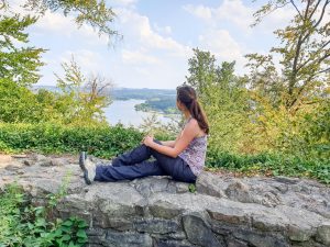 Ruine Neu-Isenburg am Baldeneysee: Frau sitzt auf Mauer - dahinter Wald und ein See